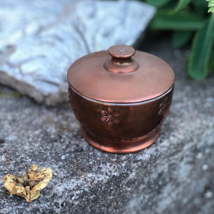 Маленькая медная сахарница или баночка с крышкой, внутри лужение, есть следы времени, имеется вмятина -1.5 см
